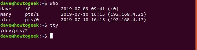 자신을 포함하여 로그인 한 모든 사용자에 대한 정보를 나열하는 who 명령어를 통해서도 tts 번호를 알 수 있는데, 아래의 출력을 통해 살펴보면 Alec과 Mary라는 사용자는 Linux 컴퓨터에 원격으로 연결되어 있고 PTS 1과 2에 연결되어 있다. 그에 비해 dave라는 사용자는 “: 0”으로 출력되어 있는데, 이는 컴퓨터에 물리적으로 연결된 화면과 키보드를 낸다. tty 명령어를 입력 했을 때 출력되는 /dev/pts/2 가 화면과 키보드는 하드웨어 장치이지만 원격으로 접속되어 pseudo-terminal master multiplexer에 연결되어 있음을 나타낸다.