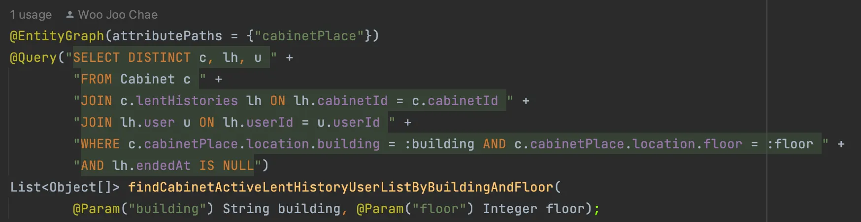이렇게 LentRepository에 cabinetId 기준으로 해당 사물함의 현재 대여 기록 및 대여자 정보를 받아오는 쿼리를 만들었고,